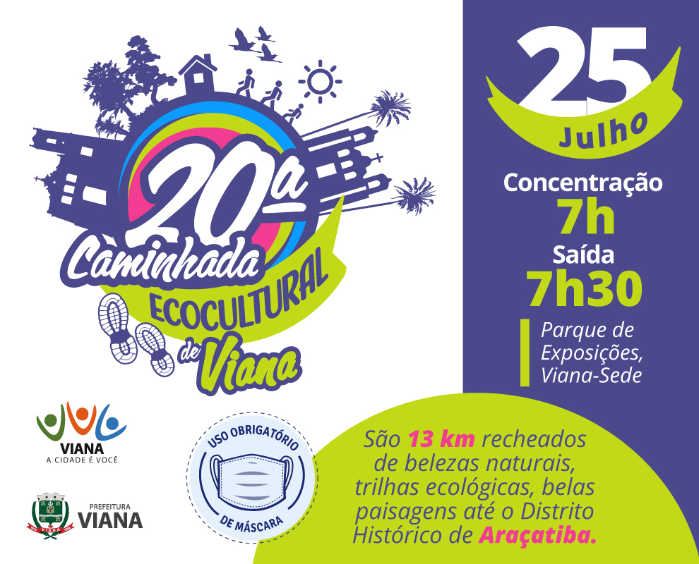 Viana celebra 159 anos de Emancipação Política e o município tem motivos para comemorar. Em meio à pandemia de Covid-19, Viana é o único município da Grande Vitória com 98% de cobertura vacinal contra a Covid-19 e mantém o risco baixo no mapa de risco divulgado pelo Governo do Estado há três semanas. Respeitando os protocolos de segurança em saúde, será realizada a 20ª Caminhada Ecocultural de Viana, que reunirá duas mil pessoas que percorrerão um trajeto de 13km. A saída será do Parque de Exposições de Viana-Sede até Araçatiba, e no caminho é possível contemplar áreas de belezas naturais, trilhas ecológicas e belas paisagens.