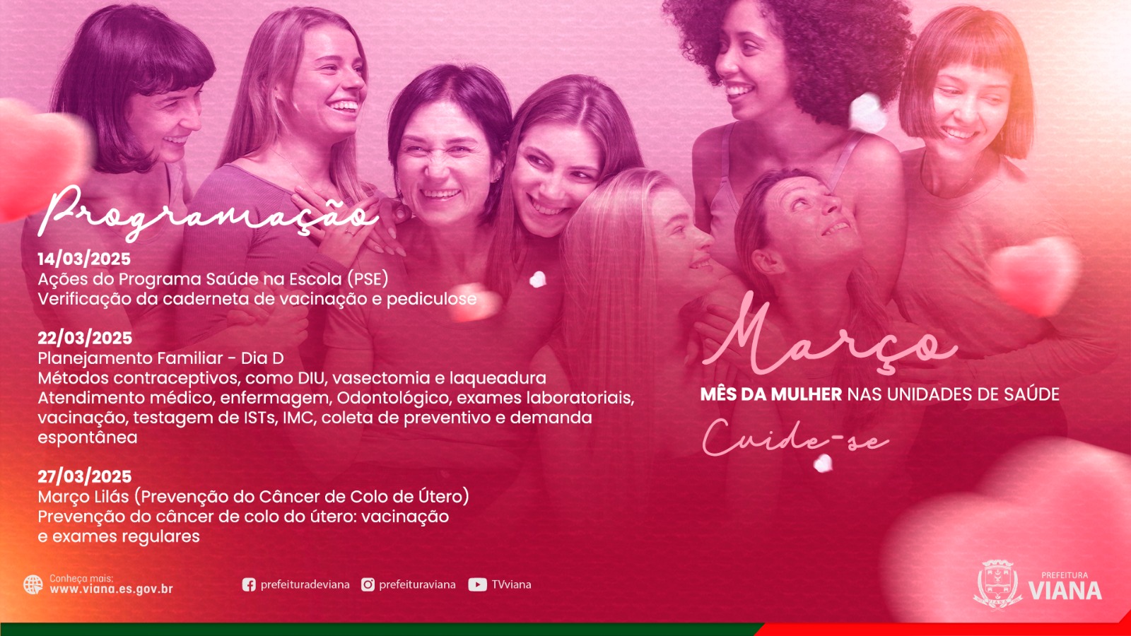 O mês de março é marcado por uma importante campanha de conscientização em prol da saúde das mulheres e prevenção ao câncer de colo do útero: o Março Lilás. Durante o período, a Prefeitura de Viana, por meio da Secretaria de Saúde (SEMSA), realizará diversas ações em todo município com o objetivo de alertar sobre os fatores de risco, informar sobre os métodos de prevenção e estimular o diagnóstico precoce.