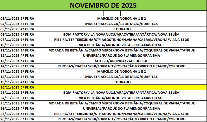 A Prefeitura de Viana, por meio da Secretaria Municipal de Saúde (SEMSA), divulga nova programação de combate a arboviroses, como Dengue, Zika e Chikungunya. A rota será feita durante a noite, até o dia 28 de novembro.