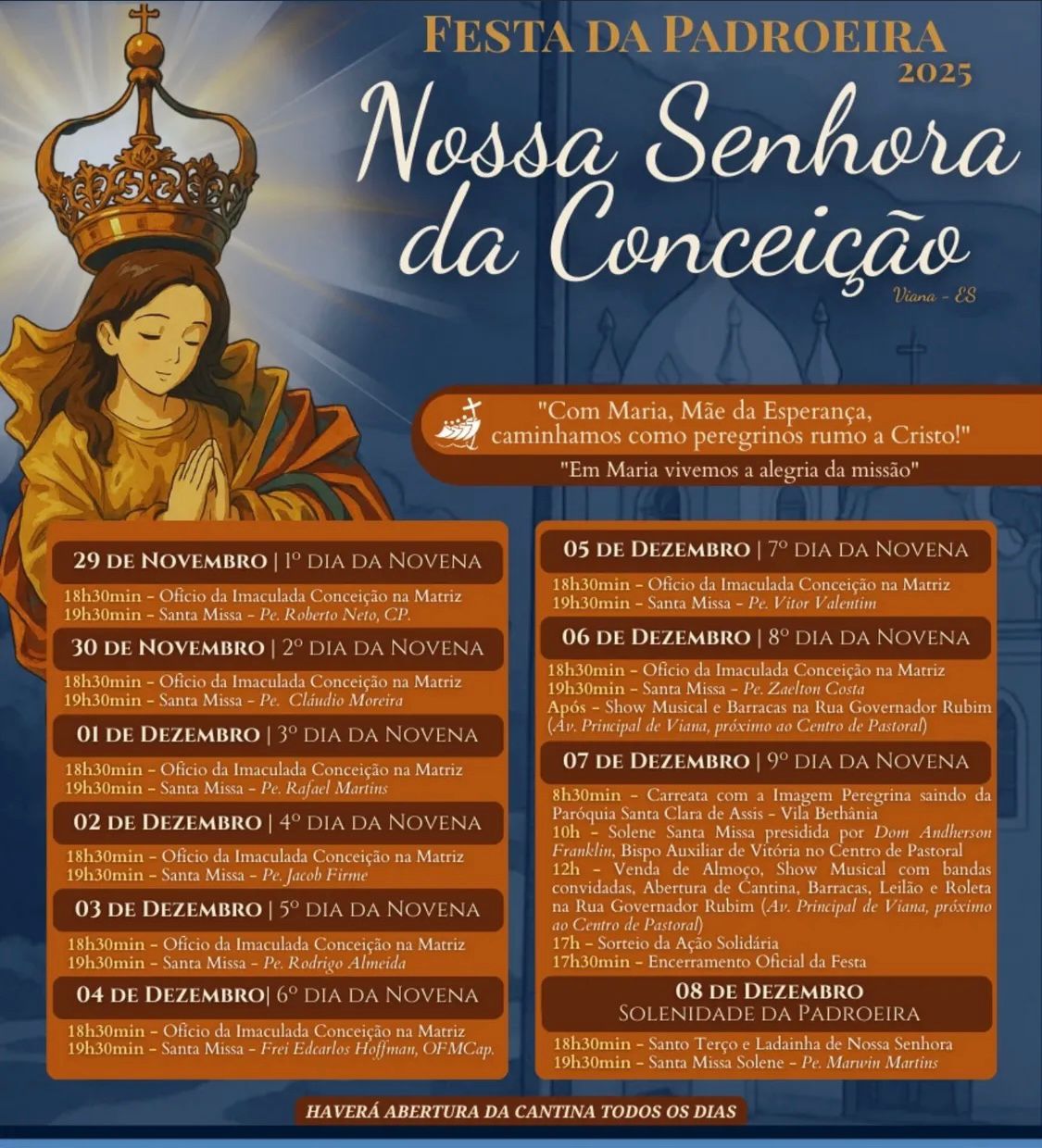 Para celebrar este 8 de dezembro, as três paróquias de Viana se reúnem em uma única celebração solene no alto da colina. A expectativa é de grande participação popular, unindo fé, tradição e reconhecimento pela importância de Maria na vida da comunidade.